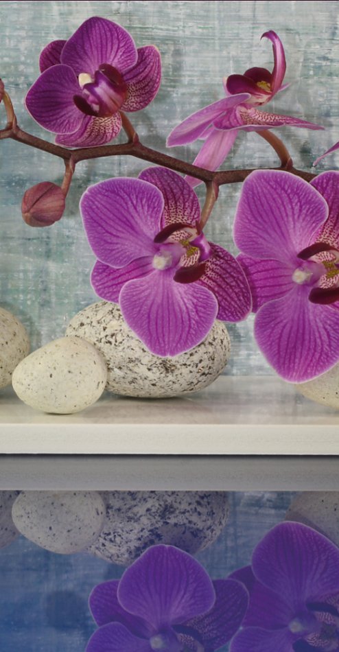 4-farbiger Druck auf Textilmaterial, rückseitig beschichtet, flammhemmend ausgerüstet, umlaufend gesäumt.