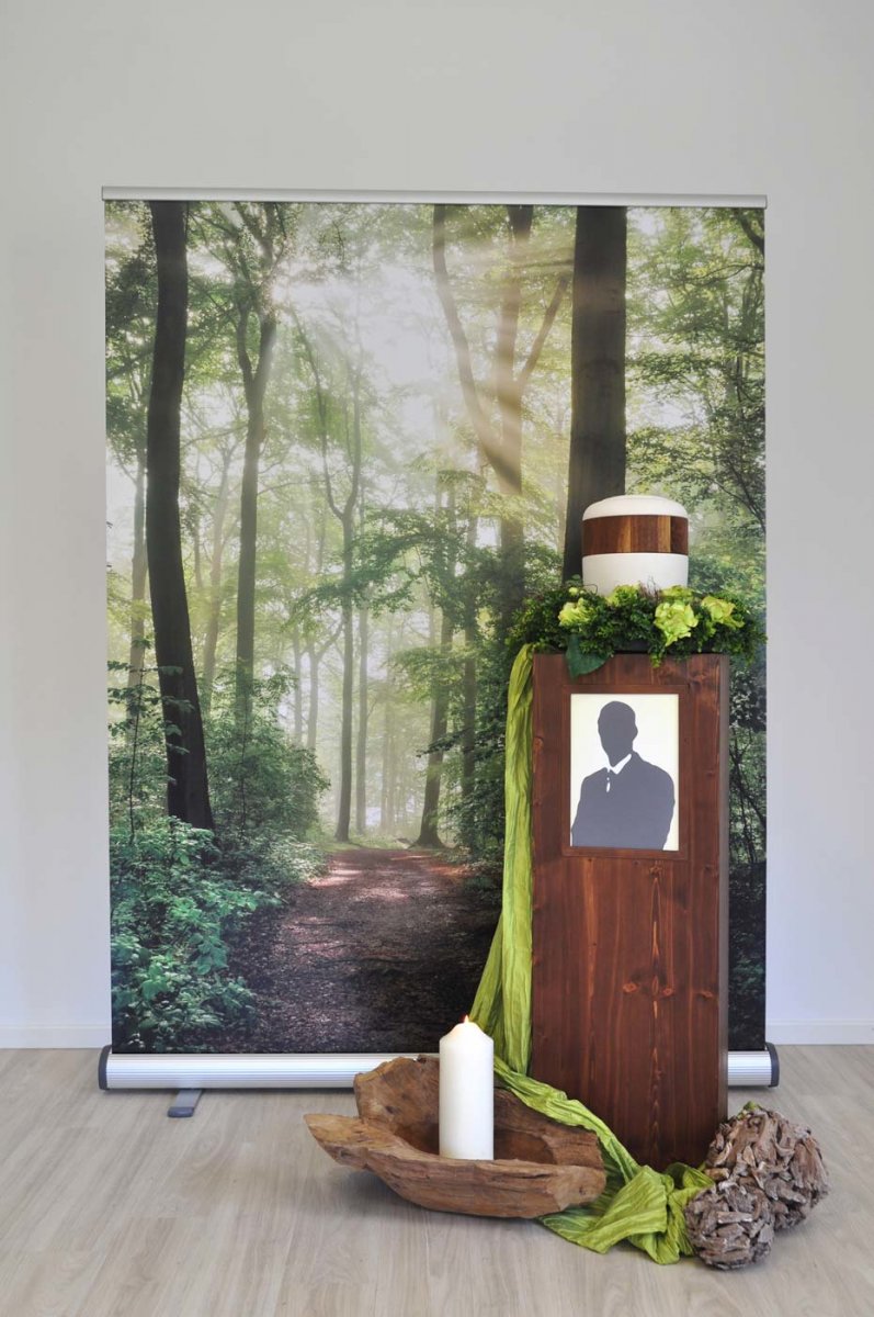 Im Trauerraum, in der Kapelle oder auf dem Friedhof ist der sehr stabile Premium-Roll-Up Ständer im Handumdrehen aufgebaut. Aufgrund seiner hochwertigen Verarbeitung gewährt er sicheren und festen Halt. In einer riesigen Motivkollektion finden Sie schnell ihren favorisierten Hintergrund. Gern gehen wir auf Ihre individuellen Wünsche ein. Motivwechsel sind möglich. Oder Sie bestellen weitere Ständer.